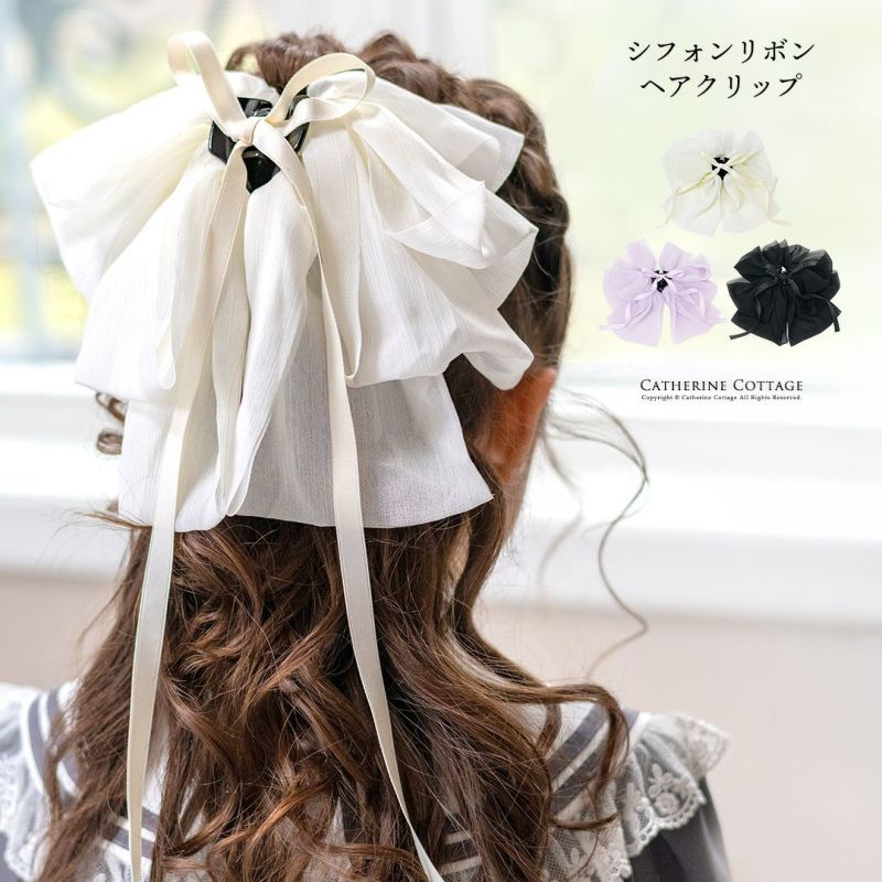 送料無料【ブラックフライデーセール12月3日まで】シフォンリボンヘアクリップ 結婚式や発表会などのフォーマルシーンにぴったり 大きめ バンスクリップ キッズ ジュニア レディース 白 黒 紫 キャサリンコテージ TAK