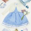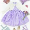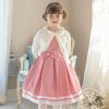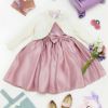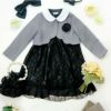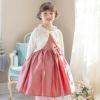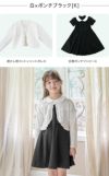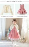 その他フォーマルシーンで主役になれるキッズドレスまたはワンピースに、フリルや透かし模様、パールボタンが華やかなニットボレロを合わせたスタイリング。