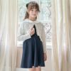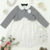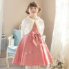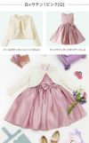 その他フォーマルシーンで主役になれるキッズドレスまたはワンピースに、フリルや透かし模様、パールボタンが華やかなニットボレロを合わせたスタイリング。