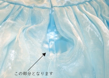 【オーガンジー素材のドレスのファスナー付近の縫い合わせ】 背中のファスナーが、ウエストの切り替えよりも10cmほど下から付けられているため、スカートのオーガンジーの縫い合わせが、ファスナーの部分だけ開けられた状態になっております。 開いた部分のオーガンジーについては、布の端処理が十分にされておりません。 |
