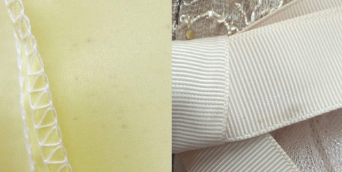 【リボン位置、ギャザー等の縫製のむら】 ウエストリボンの取り付け位置が左右でずれていたり、ギャザーの寄り方など縫製にむらがある時があります。 リボンの長さが左右で若干違う場合もあります。 |